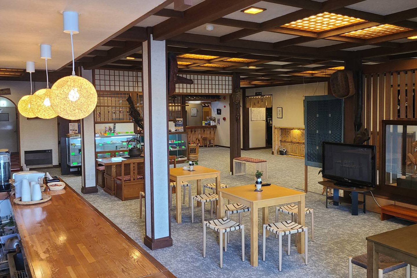 館内は、木の質感を生かした日本建築の佇まいが広がり、どこか懐かしく心落ち着く空間です。