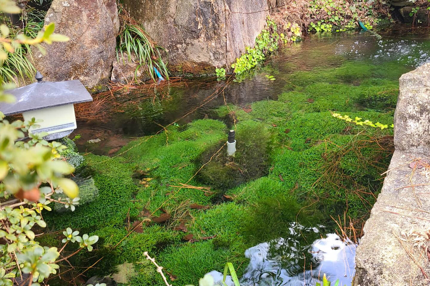 館内の庭に佇む「きよはるの池」には、イワナが一匹だけ泳いでいます。